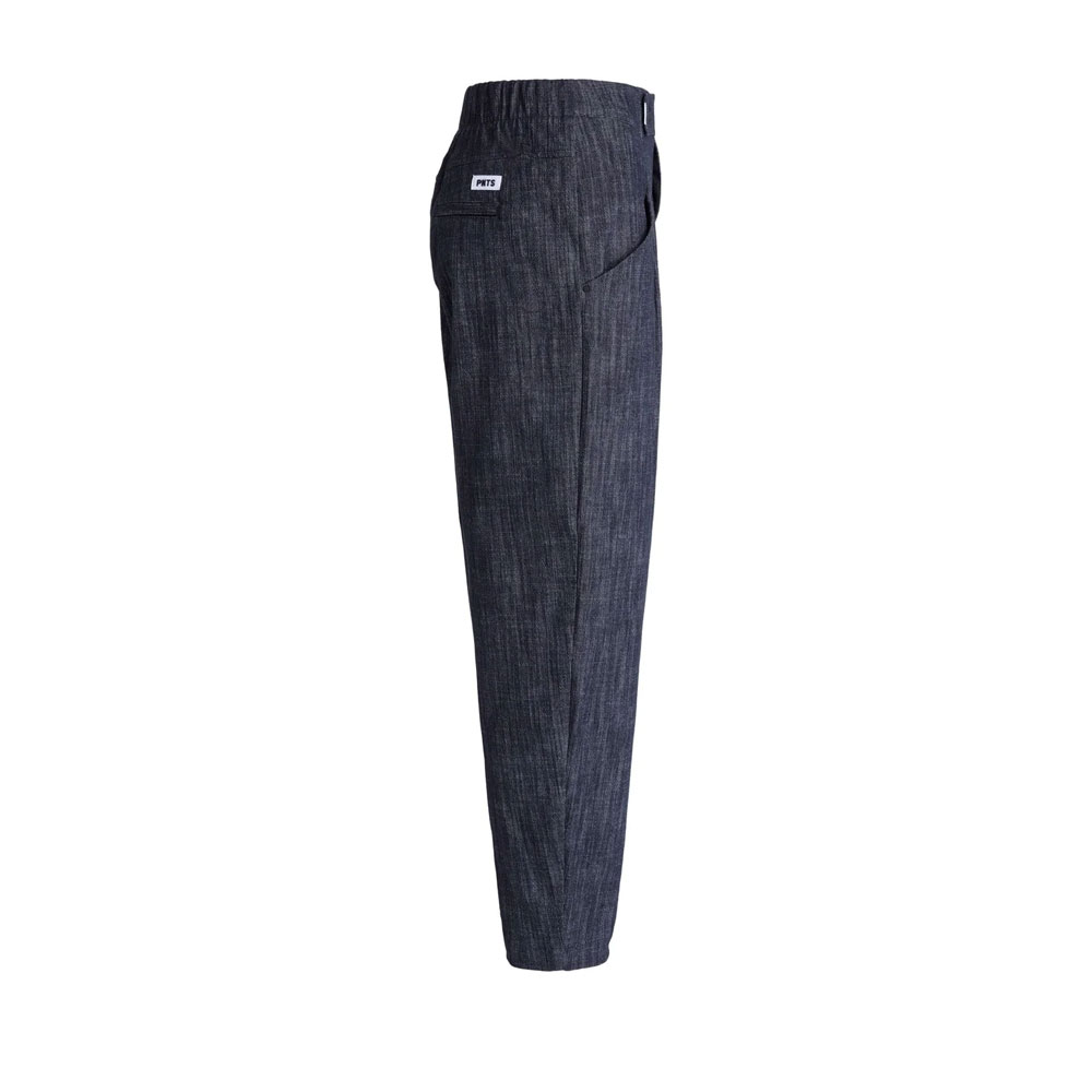 Die 06_THE JINO O kommt in einem fake Denim mit leicht strukturiertem Fischgratmuster. Sie kombiniert den lässigen Look von Jeans mit komfortablen Trageeigenschaften ohne abzufärben oder auszubluten. Die Schnittform ist eine Fusion aus Joggpant und O Shape und hat einen sehr hochwertig eingearbeiteten Gummibund in der Hinterhose. Sie hat Bundfalten und einen Riegel mit Druckknopf. Sie ist locker geschnitten mit leicht verkürzter Beinlänge.