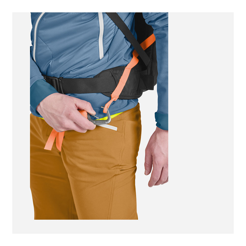 Der Packsack lässt sich mit einem umlaufenden Reißverschluss komplett aufklappen und ist mit allen Features ausgestattet, die du zum Tourengehen benötigst: Ski-, Splitboard- und Seilfixierung, Pickelhalterung oder kleines Kartenfach lassen keine Wünsche offen. Die Notfallausrüstung findet im separaten Sicherheitsfach ihren Platz. Um das Gewicht so gering wie möglich zu halten, setzen wir auf besonders leichte, aber abriebfeste Stoffe.