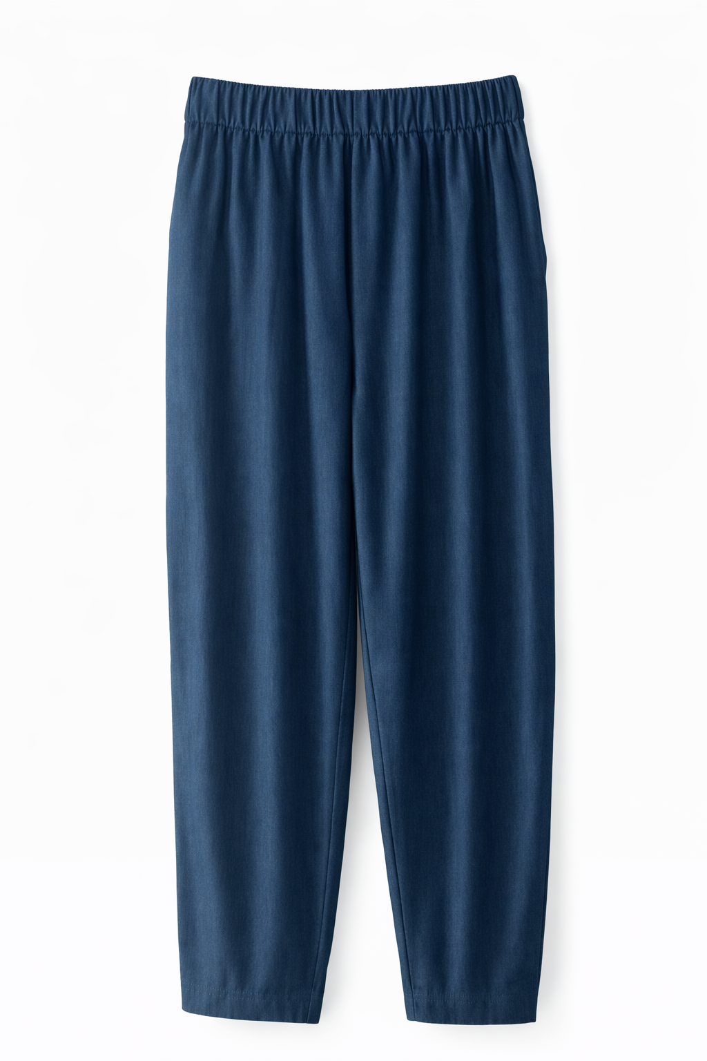 • Barrel Form • Normale Leibhöhe • Elastischer Taillenbund • Seitliche Eingrifftaschen mit Wording-Stickerei “Happy”