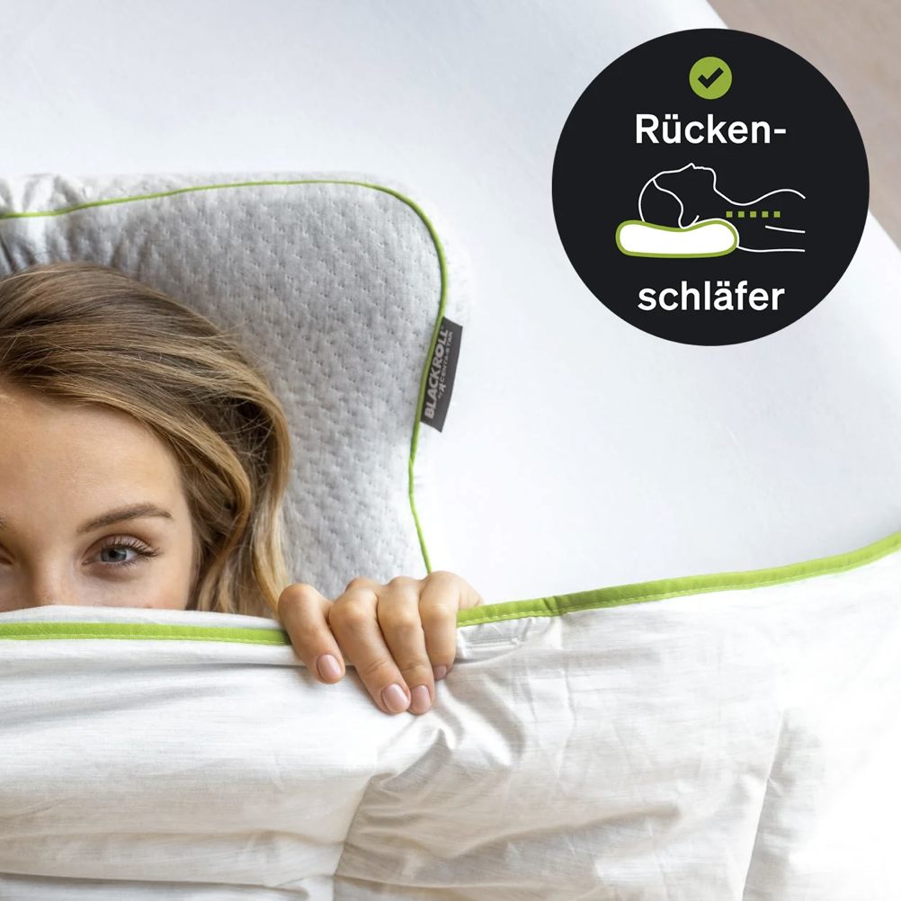 Die Kuhle des Kissens entlastet die Wirbelsäule und sorgt für Rückenschläfer und Bauchschläfer für einen angenehmen Schlafkomfort. Durch das Wenden und Drehen des Kopfkissens eignet es sich aber auch ideal für Seitenschläfer. Somit profitierst du in allen Positionen von der optimalen Stützkraft des RECOVERY PILLOWS.
