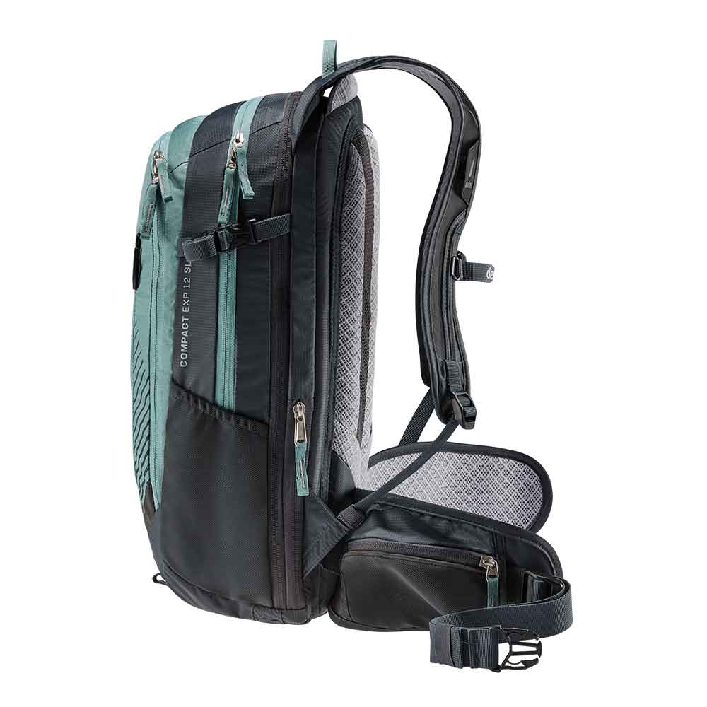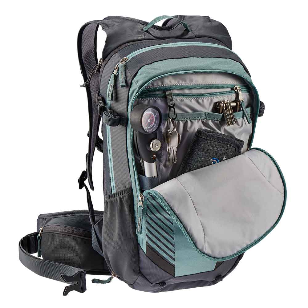 Der Compact ist ein Bike-Rucksack für Mountainbiker, der bequem und fest auf dem Rücken sitzt. Er besticht vor allem mit seiner perfekten Ausstattung: Er hat ein extra Fach für die Trinkblase, ein separates Fach für das Smartphone, ein übersichtliches Werkzeugfach, zwei Reißverschluss-Taschen auf den Hüftflossen und zwei elastische Seitentaschen. Außerdem besteht die Möglichkeit das Volumen des Rucksacks zu erweitern. Der Halbschalenhelm kann ganz einfach vorne in die Befestigungs-Clips gehangen werden, während sich die seitlichen Kompressionsriemen zur Fixierung des Fullface-Helms eignen.
