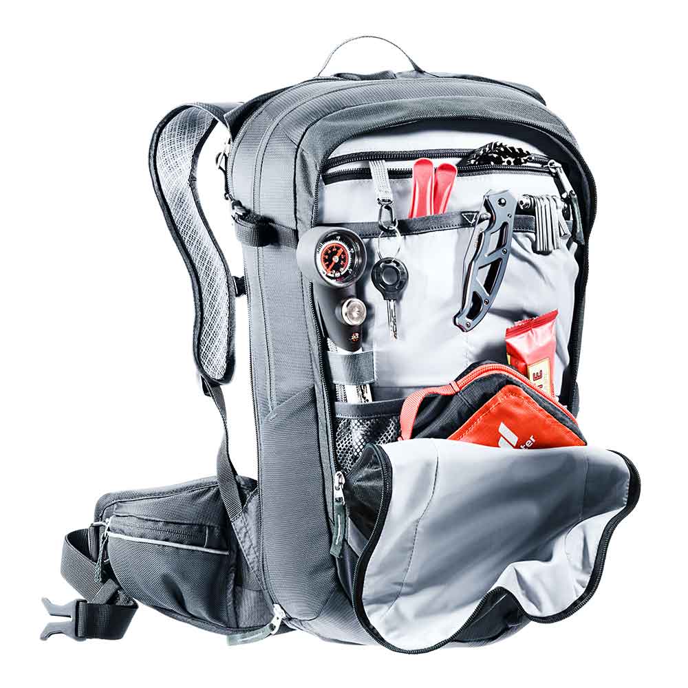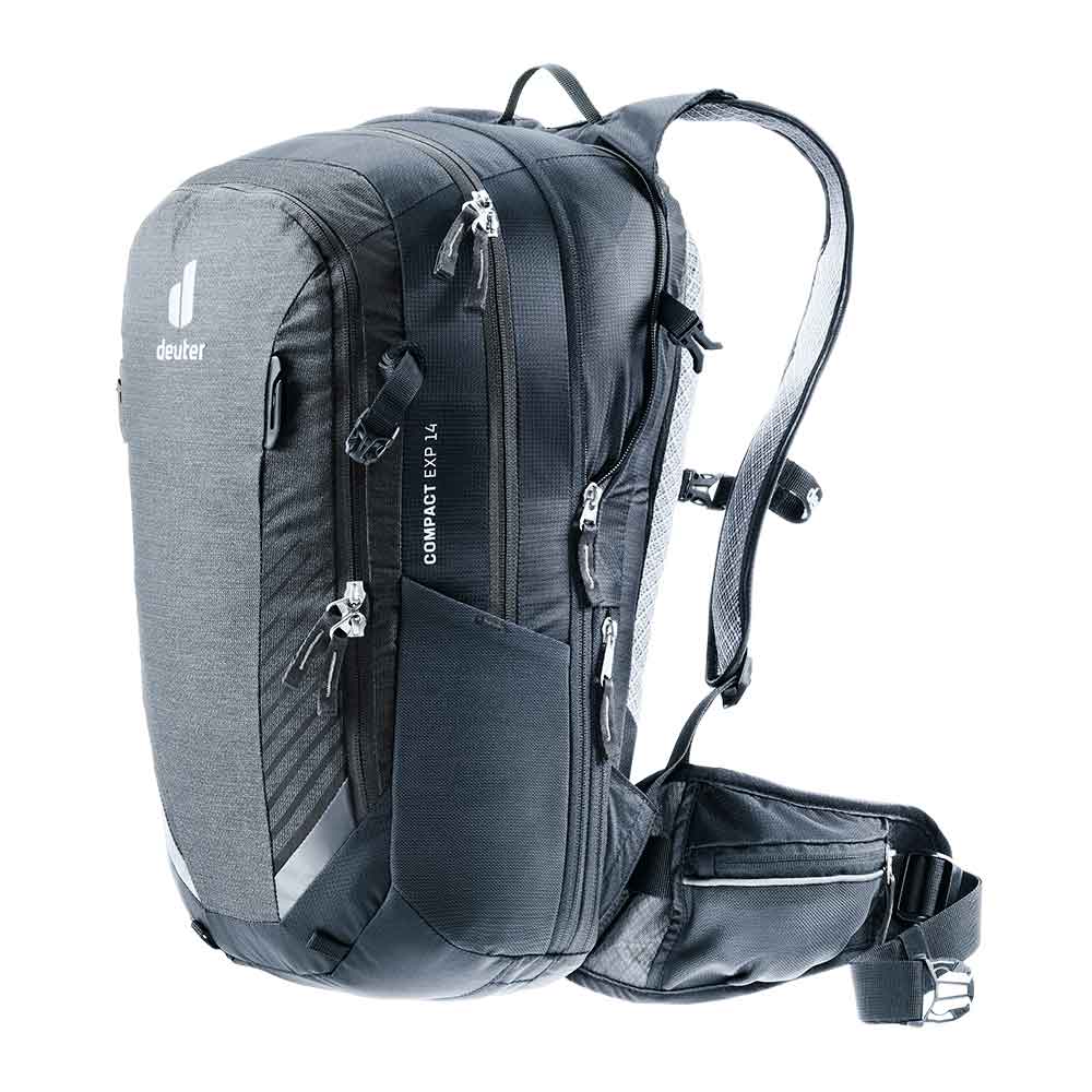 Der Compact ist ein Bike-Rucksack für Mountainbiker, der bequem und fest auf dem Rücken sitzt. Er besticht vor allem mit seiner perfekten Ausstattung: Er hat ein extra Fach für die Trinkblase, ein separates Fach für das Smartphone, ein übersichtliches Werkzeugfach, zwei Reißverschluss-Taschen auf den Hüftflossen und zwei elastische Seitentaschen. Außerdem besteht die Möglichkeit das Volumen des Rucksacks zu erweitern. Der Halbschalenhelm kann ganz einfach vorne in die Befestigungs-Clips gehangen werden, während sich die seitlichen Kompressionsriemen zur Fixierung des Fullface-Helms eignen.