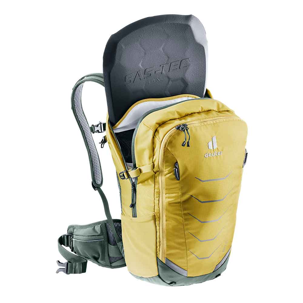 Weniger ist mehr – der gewichtsoptimierte, TÜV/GS zertifizierte Protektor-Rucksack Flyt ist auf die essenziellen Features reduziert. So sorgt ein leichter, herausnehmbarer Rückenprotektor für Schutz bei Stürzen. Zur Fixierung des Helms gibt es Clips außen am Rucksack (Halbschalen-Helm) oder seitliche Kompressionsriemen (Fullface-Helm). Zwei verstaubare Riemen am unteren Ende des Rucksacks ermöglichen zudem die Befestigung der Bike-Protektoren. Das bewährte, leichte Airstripes-System sorgt zusätzlich für ausreichende, angenehme Belüftung am Rücken.