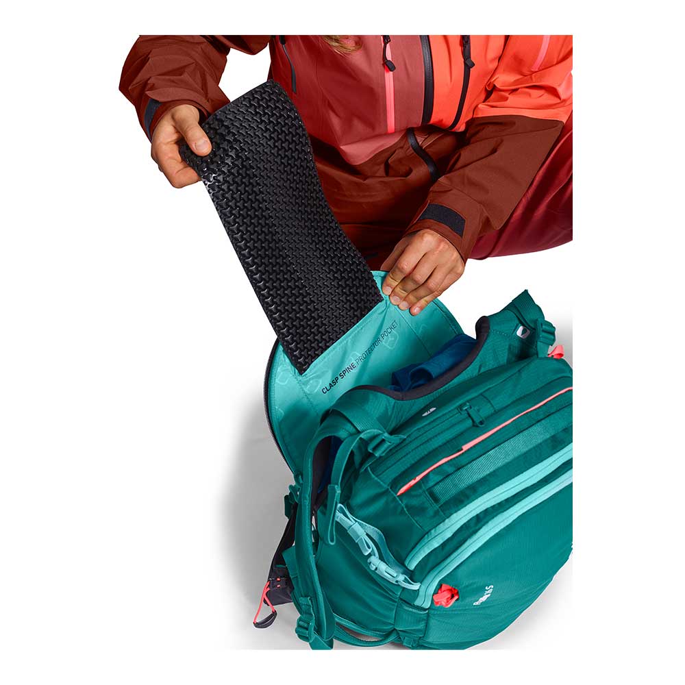 Der FREE RIDER 28 liegt beim Freeriden in jedem Gelände besonders eng am Rücken, wie eine zweite Haut. Dafür sorgt vor allem der flache, elastische Hüftgurt CLASP FLEX BELT, der Kontrolle in jeder Situation vermittelt und verlässlichen Halt liefert. Die weichen Rückenpads schmiegen sich an den Rücken, ohne die Wirbel in ihren Bewegungen zu behindern. Auf der Innenseite kann der Rucksackrücken mit dem CLASP SPINE PROTECTOR aufgestockt werden. Der Wirbelsäulenprotektor ist nach Motorrad-Norm zertifiziert und separat erhältlich. Er lässt sich unkompliziert in eine separate Innentasche schieben. Neben deiner Sicherheit steht auch die Umwelt im Fokus: der Freeride-Rucksack ist komplett PFC-frei und dank recyceltem Polyester zudem klimaneutral.
