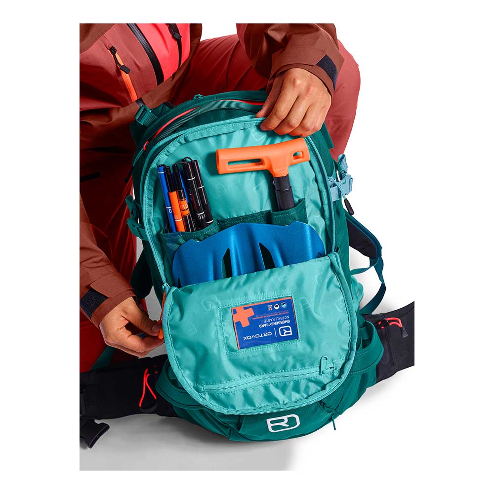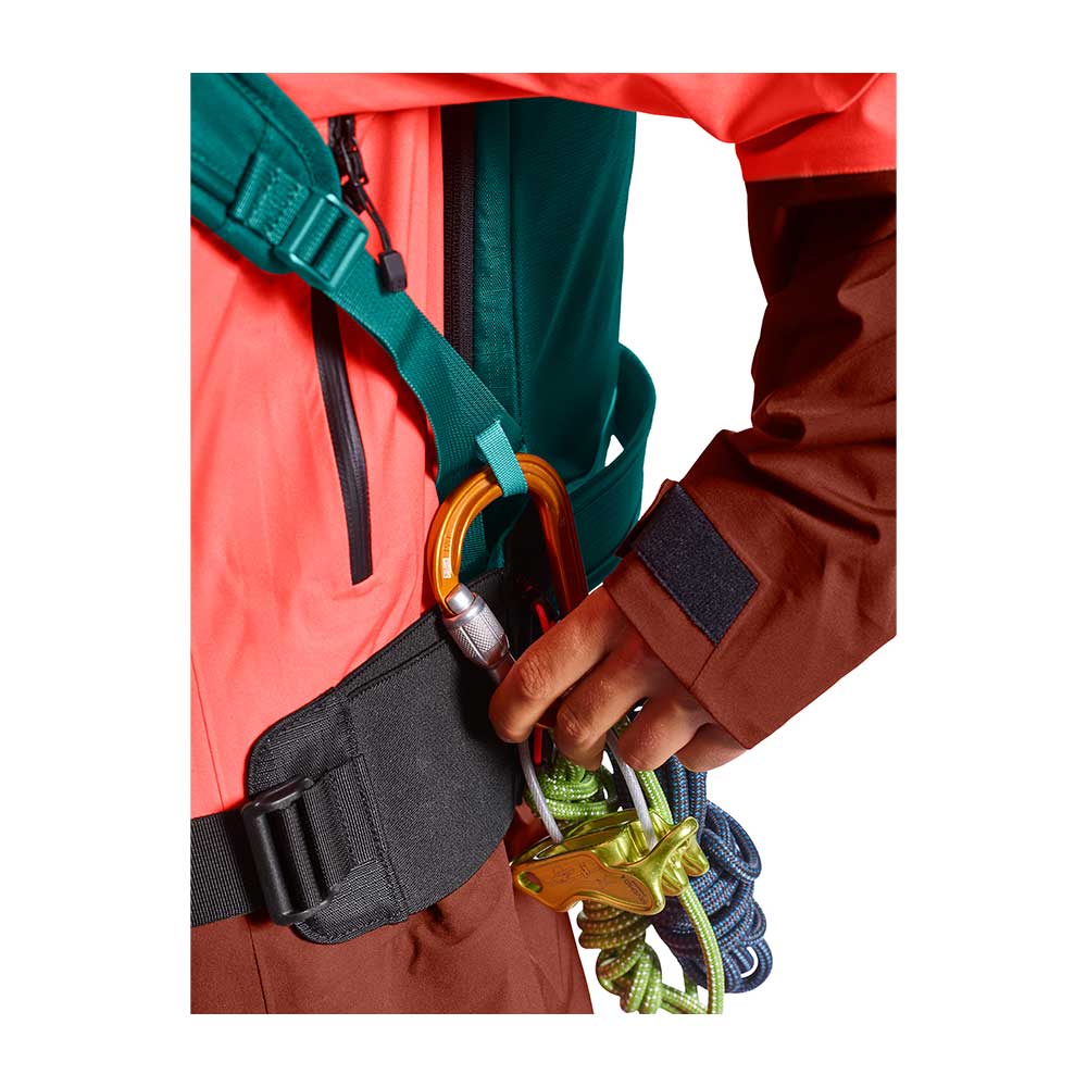 Um den Rucksack auch unterwegs bestmöglich anzupassen, kann er durch seitlich integrierte Gurtbänder schnell komprimiert werden und faltet sich zu einer flach anliegenden, zweiten Haut am Rücken. Zum Abseilen in steilen Rinnen oder bei kurzen Geh-Passagen hat der Freeride-Rucksack alle nötigen Befestigungsmöglichkeiten für Ski, Eispickel oder Seil, und auch das bewährte Helmnetz, die Notfallkarte und Trinksystemvorbereitung fehlen nicht. Dabei sind alle Features außen gut verstaut, um selbst in unwegsamem Gelände nirgends hängen zu bleiben.