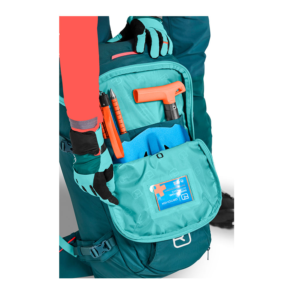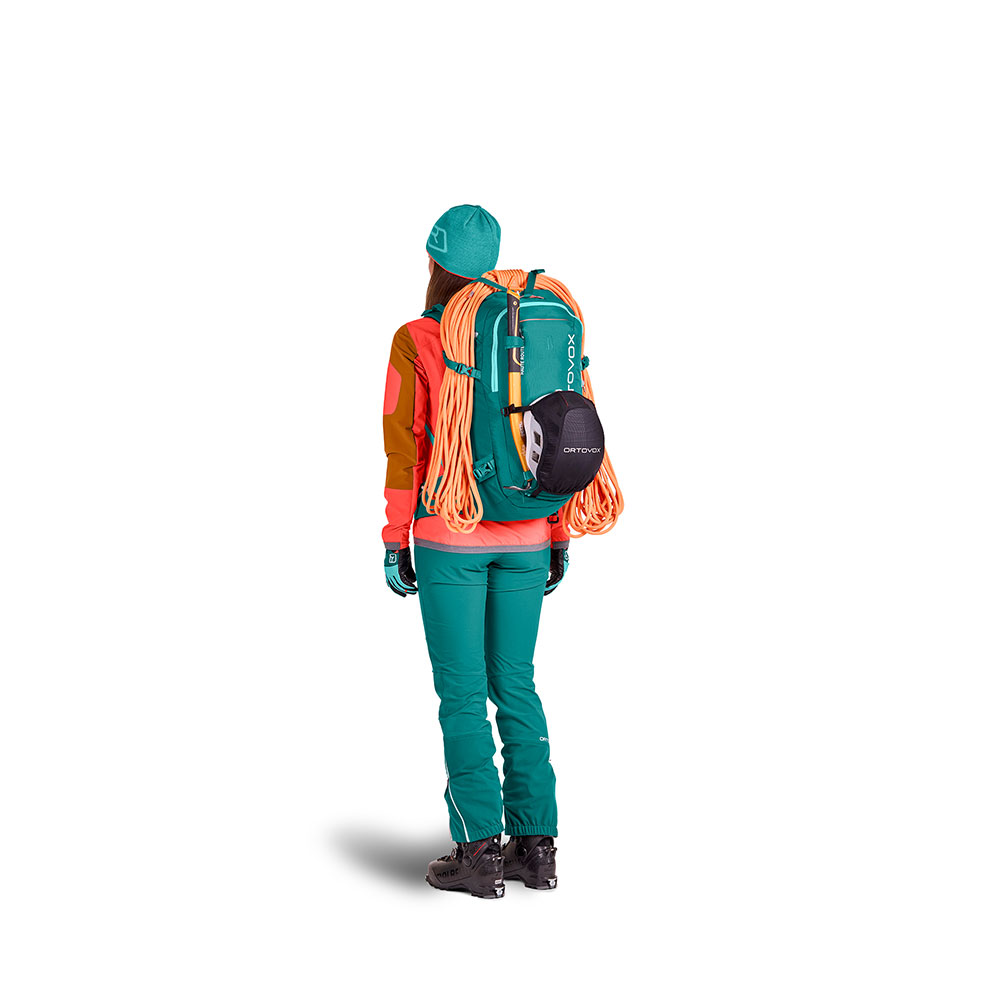 Mit seinem größeren Volumen passt in den HAUTE ROUTE 38 S alles hinein, was dabei sein sollte. Das geräumige Hauptfach ist von oben und vom Rücken zugänglich, sodass alle Sachen schnell bei der Hand sind, während das separate Sicherheitsfach gleichzeitig den schnellen Zugriff auf die Notfallausrüstung garantiert. Dank Seilfixierung am Rucksackdeckel kann zudem ein mitgeführtes Seil schnell ein- oder ausgepackt werden, ohne den Deckel öffnen zu müssen. Neben Steigeisenfixierung, Pickel- und Stockbefestigung sowie fixiertem Helmnetz stehen zusätzlich flexible Tragebefestigungen z.B. für ein Snowboard zur Verfügung. Die Ski lassen sich klassisch als auch diagonal am Skitourenrucksack befestigen.