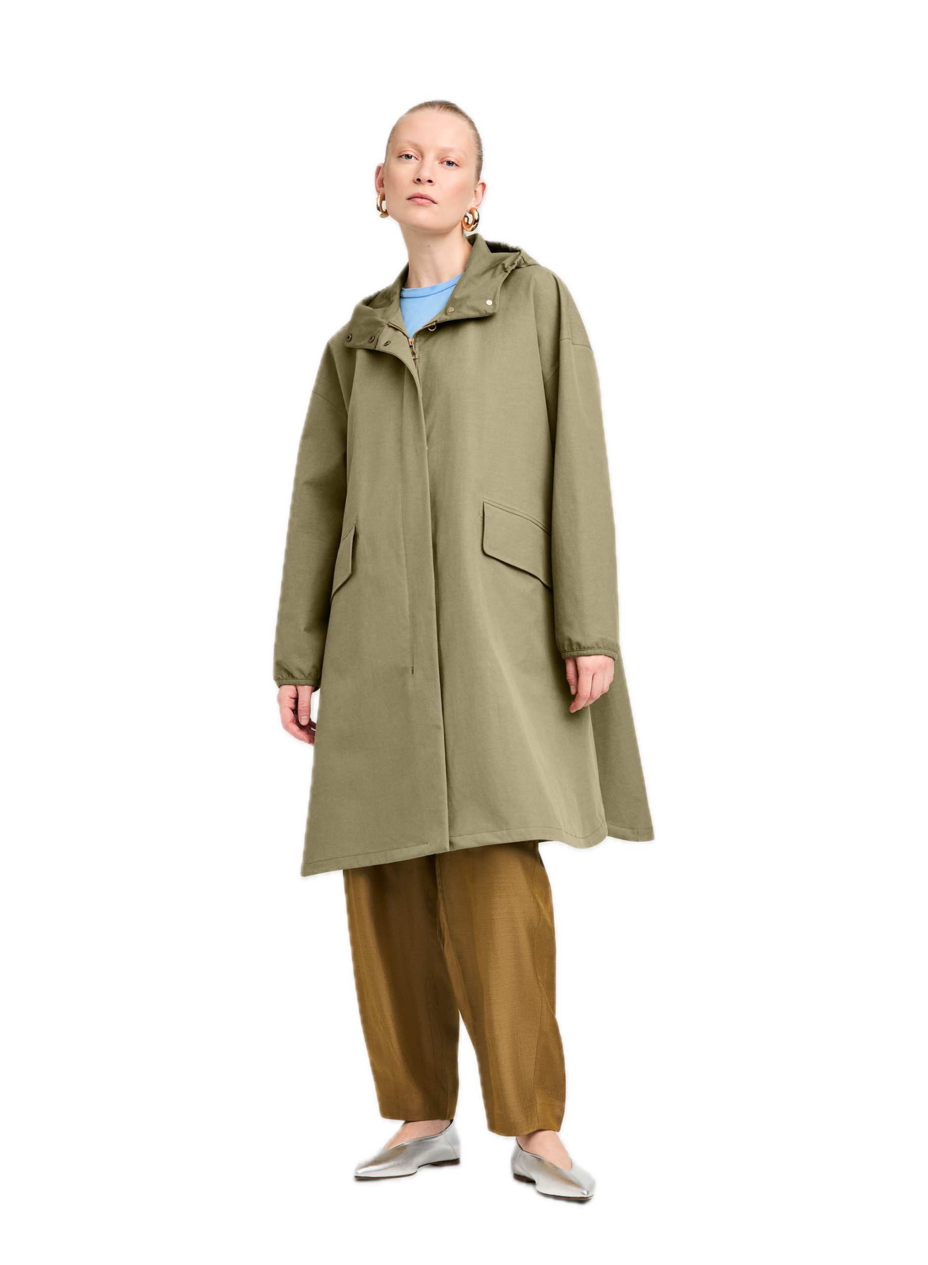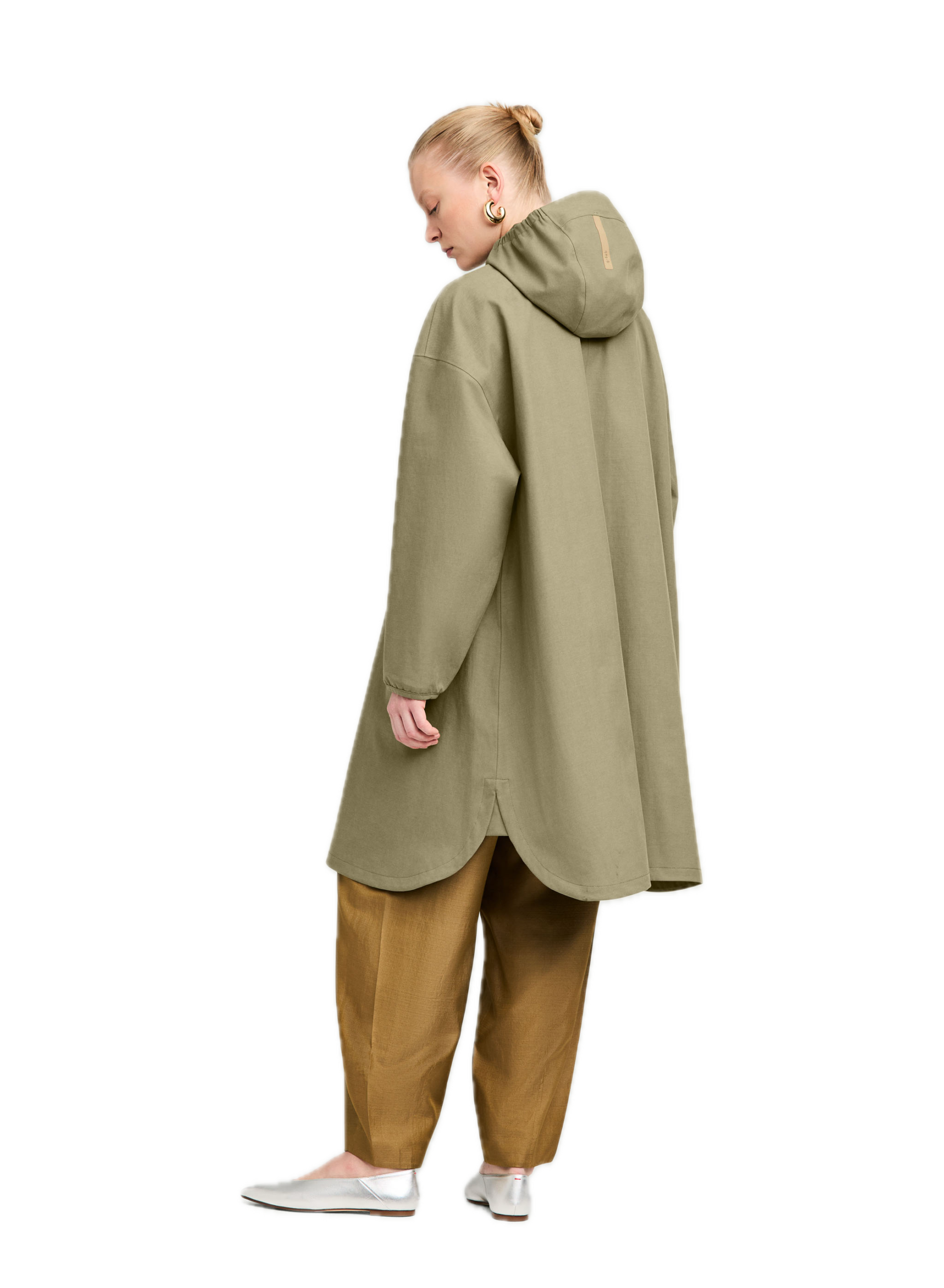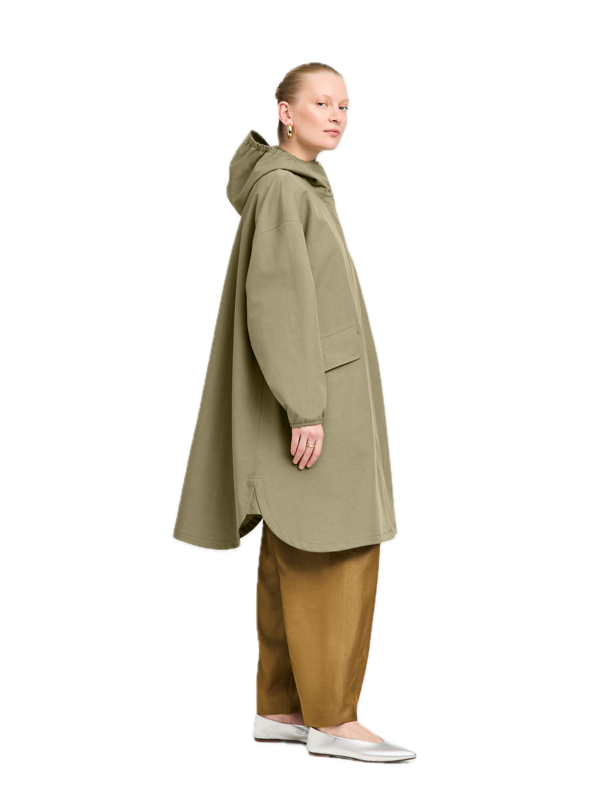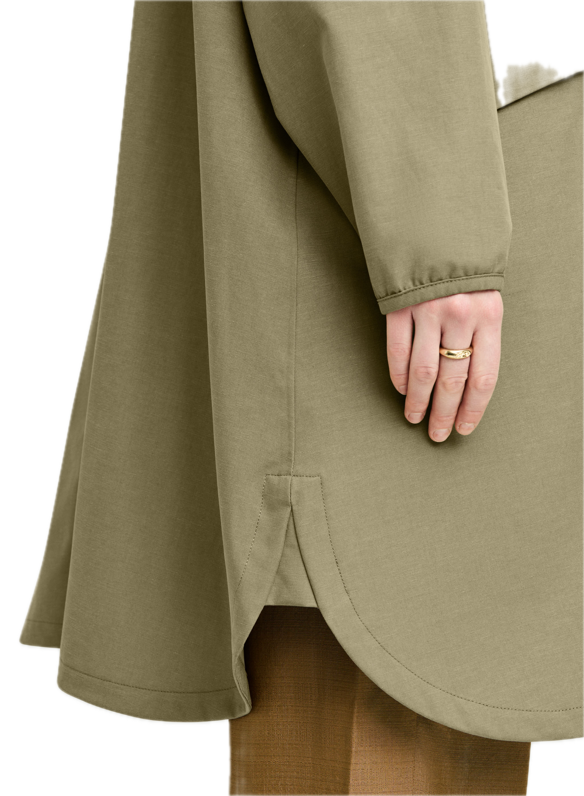 Der Cape-Mantel NORA ist das perfekte Statement-Piece für alle, die moderne Outerwear mit einem Hauch Drama lieben. Die feminine A-Silhouette fällt wunderschön fließend und wirkt gleichzeitig lässig und elegant – ideal, um selbst schlichte Looks sofort aufzuwerten. Besonders praktisch (und stylish): Die Frontleiste mit Druckknöpfen und die großen Pattentaschen mit Magnetverschluss machen NORA absolut alltagstauglich. Ein leicht geraffter Ärmelabschluss sorgt für Komfort, und der geschwungene Saum mit dekorativem Seitenschlitzdetail verleiht dem Cape eine moderne, bewegte Linie.