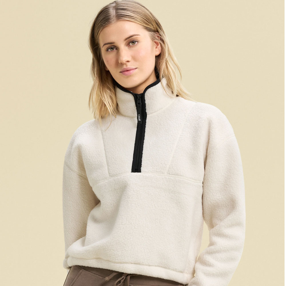 Taillenkurze Teddyjacke aus 100 % recyceltem Polyester. Halblanger Frontreißverschluss, verstellbare Passform und hoher Stehkragen, der dich an kälteren Tagen warmhält. Perfekt für Spaziergänge, Ausflüge und Athleisure.