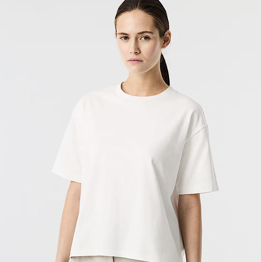 Dieses Shirt steht für lässige Eleganz und zeitlosen Minimalismus. Die lockere Passform mit überschnittenen Schultern sorgt für eine entspannte Silhouette, während der gerippte Rundhalsausschnitt dem Design eine klare, moderne Linie verleiht.