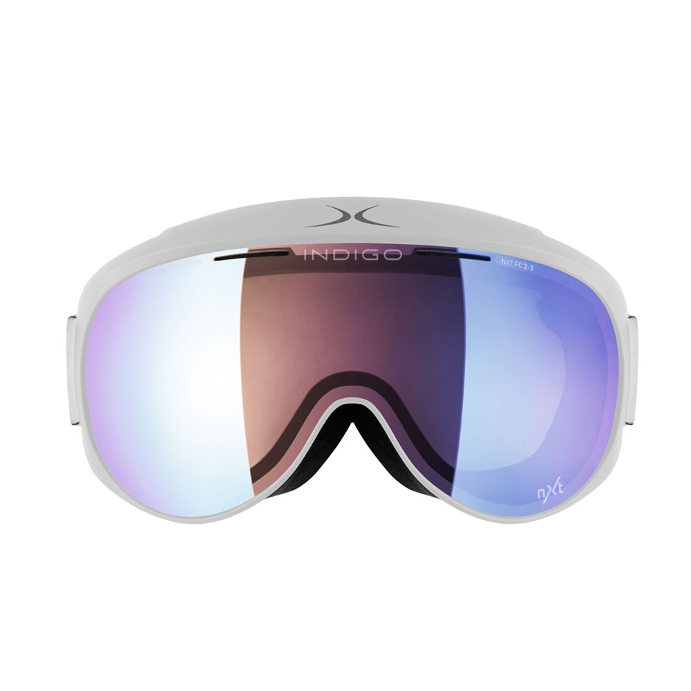 Die besten technischen Eigenschaften eines Helmvisiers und einer Schneebrille wurden nun in einem unvergleichbaren, völlig neuen Produkt vereint. Die INDIGO “VOGGLE”. Die revolutionäre INDIGO VOGGLE ist die Symbiose aus einer passgenauen, abnehmbaren und perfekt abdichtenden Schneebrille mit unglaublichem Raumgefühl. Das einzigartige 230° Grad Sichtfeld stellt einen Quantensprung in punkto Sicherheit dar. Mit automatischer Passform durch neuartige Gummilippe für nahezu alle gängigen Schneesporthelme löst die VOGGLE somit klassische Brillen- und Visierlösungen ab. Da die INDIGO VOGGLE oben auf dem Helm aufliegt gehören Brillen-Druckstellen der Vergangenheit an. Durch den weichen 2-lagigen Schaum, der nur ganz leicht das Gesicht berührt, werden Sie Ihre VOGGLE kaum spüren und ein völlig neues Tragegefühl erleben. Die Doppelscheibenkonstruktion aus Polycarbonat in Kombination mit dem ausgeklügelten Belüftungssystem gewährleistet beste Anti-Fog-Eigenschaften. Eine hochmoderne NXT® Photochrome Scheiben-Technologie bietet in jede Situation den richtigen Schutz.. Von Filterkategorie 1 wenn sie nicht aktiviert ist in Umgebungen und Wetterbedingungen mit wenig Licht, bis zu Filterkategorie 3 wenn sie aktiviert ist bei hellen Lichtverhältnisse. Zusätzlich bietet die NXT® Scheibe einen großartigen Look! Je nach aktivierungsgrad, von dezentem Glanz bis hin zu intensiven Blau Spiegel.